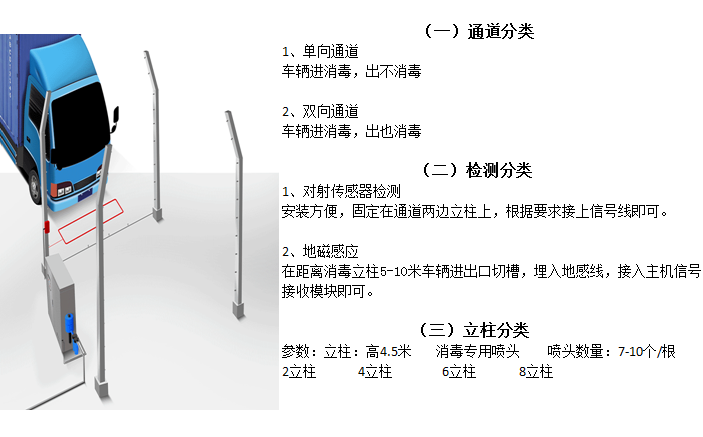 車輛消毒通道主要用途是為預(yù)防及防治流感、口蹄疫、霍亂、流行性疾病等病毒病菌的傳播,擴(kuò)散,需要在消防站、防疫站、省道、國道、高速公路、城鄉(xiāng)交接處、出入境檢疫站、無害化處理中心等處對貨物運(yùn)輸車輛、消防車輛及其它進(jìn)出通行的車輛進(jìn)行徹底的消毒,防止車輛外表面帶來的病原體擴(kuò)散傳播,達(dá)到進(jìn)出車輛防疫消毒目的。本消毒通道在消毒方式上采用高壓沖擊噴霧技術(shù),符合SN/T1333-2012《入出境汽車及其他車輛消毒規(guī)程》標(biāo)準(zhǔn)要求。